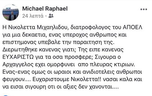 Ο Μιχαλάκης Ραφαήλ, πρώην μέλος του ΔΣ του ΑΠΟΕΛ (επί Φοίβου Ερωτοκρίτου) ευχαριστεί την διατροφολόγο της ομάδας μετά από μια δεκαετία και διερωτάται γιατί υπέβαλε την παραίτηση της. Δείτε την ανάρτηση του: