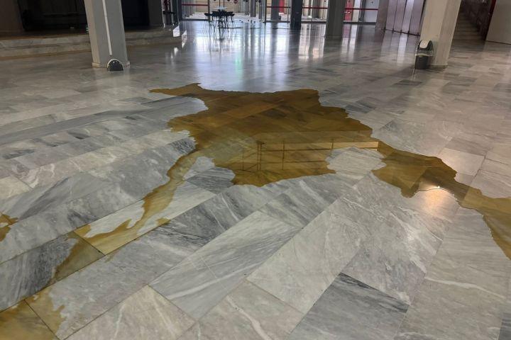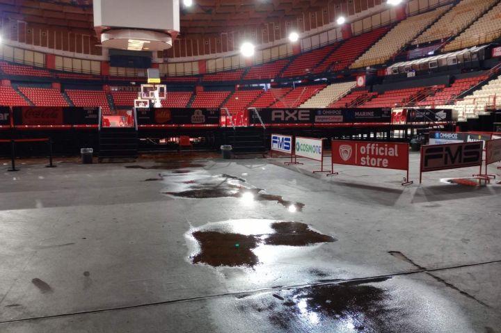 Η οροφή του ΣΕΦ στάζει σε πολλά σημεία, με τους «ερυθρόλευκους» να προσπαθούν να βελτιώσουν την κατάσταση, την ίδια στιγμή που προς το παρόν δεν μπορεί να υπολογιστεί το μέγεθος της ζημιάς στο παρκέ, αφού αυτό μπορεί να εκτιμηθεί αφού απομακρυνθεί το νερό.