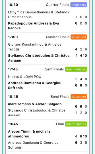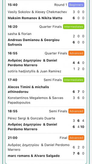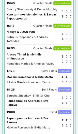 Στα αποτελέσματα των «μαχών», στην κατηγορία των «Beginners», ο τελικός κρίθηκε κυριολεκτικά στις λεπτομέρειες. Το δίδυμο των Παπαδόπουλος/Πάνοβα επικράτησε των Ρομανόφ/Μάτο με 2-0 σετ, 7-6, 7-5, σε μια αναμέτρηση γεμάτη «μεγάλα» games, όπου η μεγαλύτερη σταθερότητα στις επιστροφές και η ψυχραιμία στα κρίσιμα σημεία έδωσαν το τρόπαιο.