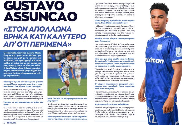 Ο Γκουστάβο Ασουνσάο παραχώρησε δηλώσεις στο περιοδικό του Απόλλωνα, καθώς η ομάδα ετοιμάζεται να δοκιμαστεί στην αναμέτρηση με την Ομόνοια στο ΓΣΠ.