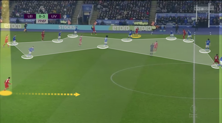Στην δεδομένη φάση, σκόρερ ήταν ο Alexander-Arnold, ο δεξιός πλάγιος μπακ της Liverpool, που όπως θα δούμε στην ανάλυση που κάναμε στην πλατφόρμα του Wyscout, εκμεταλλεύτηκε το μάζεμα όλης της ομάδας του αντιπάλου στην μια πλευρά. Οι 10 παίκτες της Leicester ήταν όλοι στην μια πλευρά και ο διάδρομος ήταν ανοικτός για τον παίκτη που εκμεταλλεύτηκε την ταχύτητα του στην γρήγορη επίθεση που βγάζει η ομάδα μετά από ένα πλάγιο άουτ.