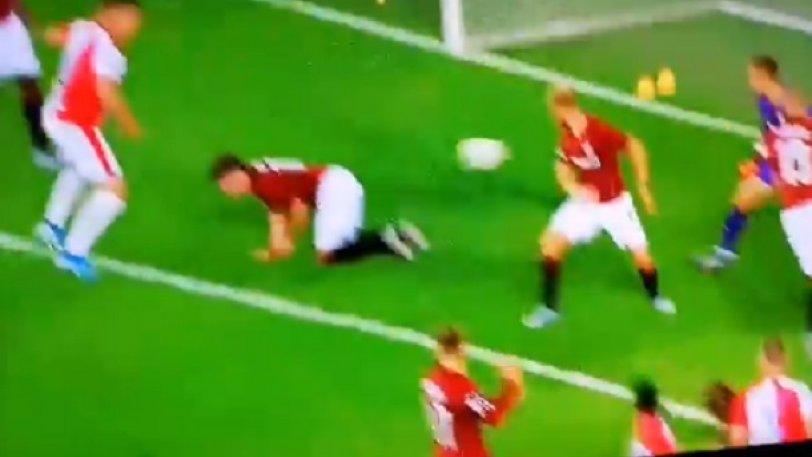 Άθελά του και όντας πεσμένος στην μικρή περιοχή, ο 23χρονος μέσος απλά κατάλαβε τη μπάλα να χτυπάει... στον πισινό του και να καταλήγει στα δίχτυα για να γίνει το 2-0, προτού η Σλάβια πετύχει και τρίτο γκολ για να θριαμβεύσει στο ντέρμπι.