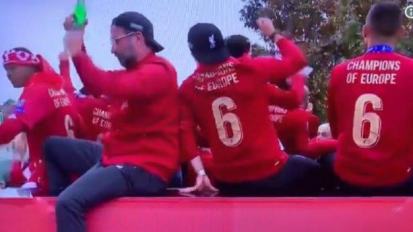 Ο Γούργκεν Κλοπ πανηγυρίζει για το 6ο ευρωπαϊκό πρωτάθλημα των Reds, έχει στο χέρι μια μπύρα, χαιρετά τον κόσμο, αλλά λίγο έλειψε να χάσει τον έλεγχο και να πέσει από το πούλμαν! Ο Γερμανός στάθηκε τυχερός κι έγινε πιο προσεκτικός...