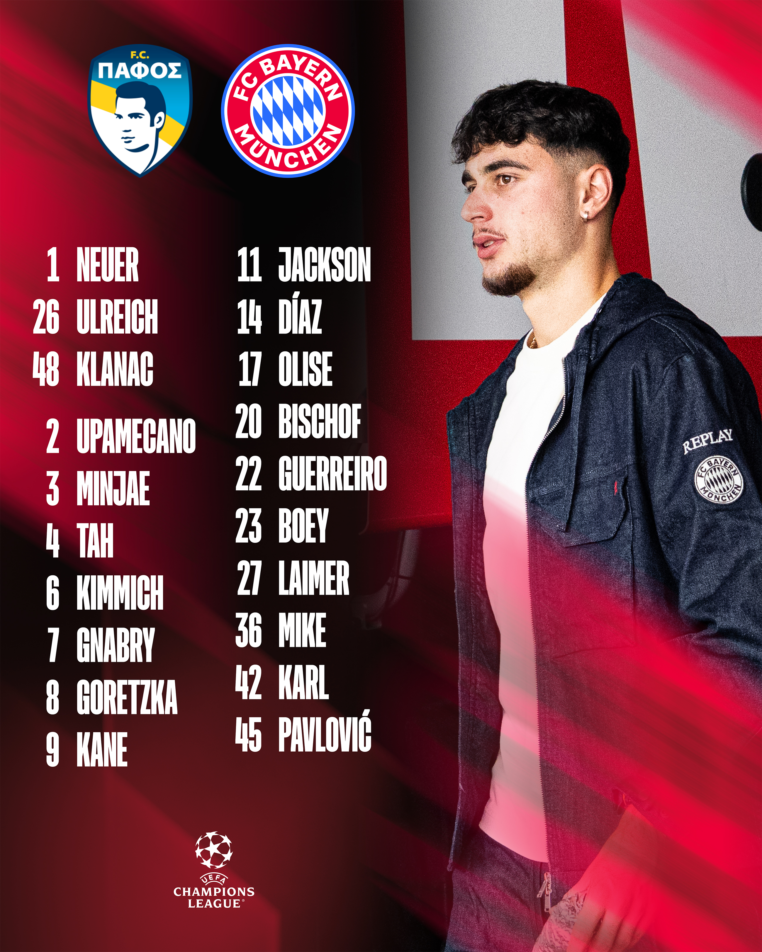 Μετά την τελευταία προπόνηση (στο Μόναχο) και πριν την επιβίβαση στο αεροπλάνο με προορισμό την Κύπρο, η Μπάγερν ανακοίνωσε την αποστολή του αγώνα της με τον Πάφο, για τη δεύτερη αγωνιστική στη league phase του Τσάμπιονς Λιγκ.