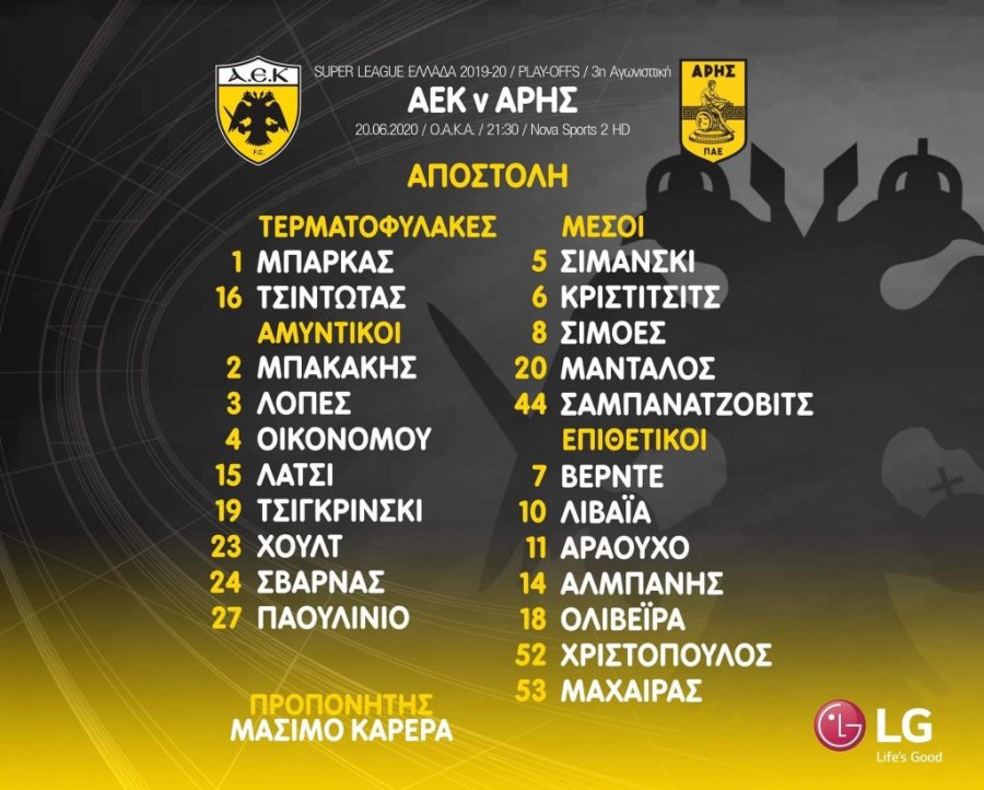 Μετά την προπόνηση της Παρασκευής (στην οποία άπαντες γυμνάστηκαν κανονικά πλην των Γαλανόπουλου και Μπότου που συνέχισαν τα ατομικά τους προγράμματα), ο Μάσιμο Καρέρα επέλεξε την αποστολή για το ματς της 3ης αγωνιστικής των πλέι-οφ.