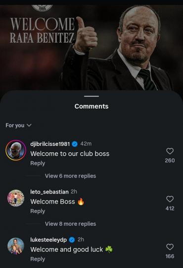 Η συγκεκριμένη έλευση, ενθουσίασε τρεις πρώην άσους του Παναθηναϊκού, οι οποίοι έσπευσαν κάτω από το ποστάρισμα της ΠΑΕ στο Instagram να καλωσορίσουν τον Μπενίτεθ, σχολιάζοντας. Ο λόγος για τον Τζιμπρίλ Σισέ και τον προπονητή της Κηφισιάς, Σεμπάστιαν Λέτο, με τον οποίο είχαν συνεργαστεί ως ποδοσφαιριστές στη Λίβερπουλ, αλλά και ο πρώην Άγγλος τερματοφύλακας, Λουκ Στιλ.