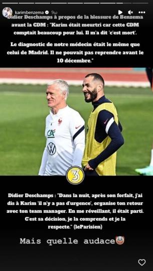 Ο Καρίμ Μπενζεμά σχολίασε τη συγκεκριμένη δήλωση στο πρώτο του story λέγοντας: "Τι θράσος" και το συνόδευσε με ένα emoji κλόουν. Έπειτα έκανε ένα ακόμα story στο οποίο έγραψε: "Καληνύχτα Άγιε Ντιντιέ" και το συνόδευσε ξανά με ένα emoji του κλόουν.