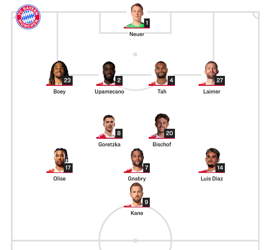 Ο Βινσέντ Κομπαλί ξεκινάει με τον Νόιερ στο τέρμα και άμυνα τους Μποέι, Ουπαμεκάνο, Τά και Λάιμερ, στέλνοντας μήνυμα ετοιμότητας, προσπαθώντας να «κρατήσει» το «μηδέν». Γκορέτσκα και Μπίσοφ κράτησαν τη μεσαία γραμμή, ενώ οι Ολίσε, Γκνάμπρι και Λουίς Ντίαζ πλαισίωσαν τον Χάρι Κέιν. Οι Πάβλοβιτς και Κίμιχ έμειναν στον πάγκο.