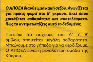 «Χάρηκα πολύ, η μεγαλύτερη ομάδα της Κύπρου» Α' ΚΑΤΗΓΟΡΙΑ ΑΠΟΕΛ 19.03.202116:30 Ο Ράφαελ Σάντος μίλησε στο επίσημο περιοδικό του ΑΠΟΕΛ ενόψει και της αναμέτρησης με τη Δόξα. Αναλυτικά: CLOSE