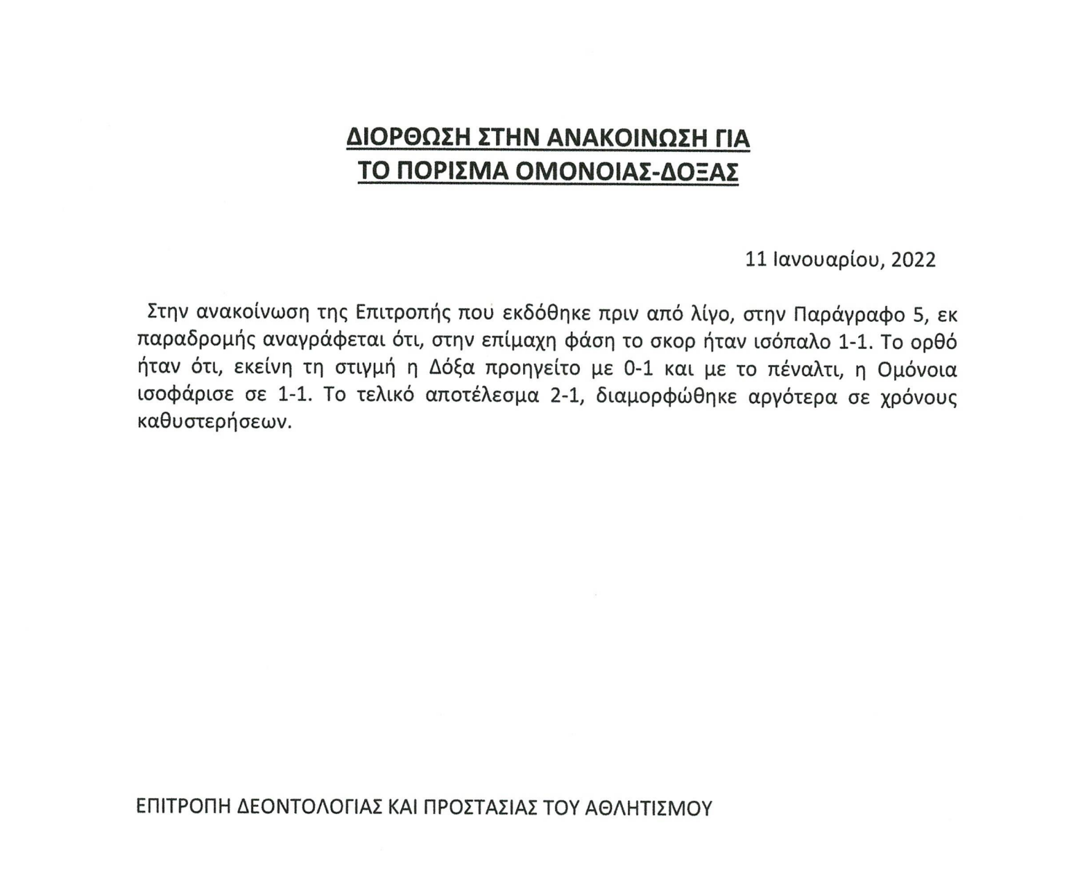 Η επιτροπή δεοντολογίας και προστασίας αθλητισμού προχώρησε σε διόρθωση της αναφοράς της πως η επίμαχη φάση στον αγώνα με Ομόνοιας-Δόξας ήταν στο προβάδισμα της Ομόνοιας με 2-1 ενώ η επίμαχη φάση ήταν στο 0-1