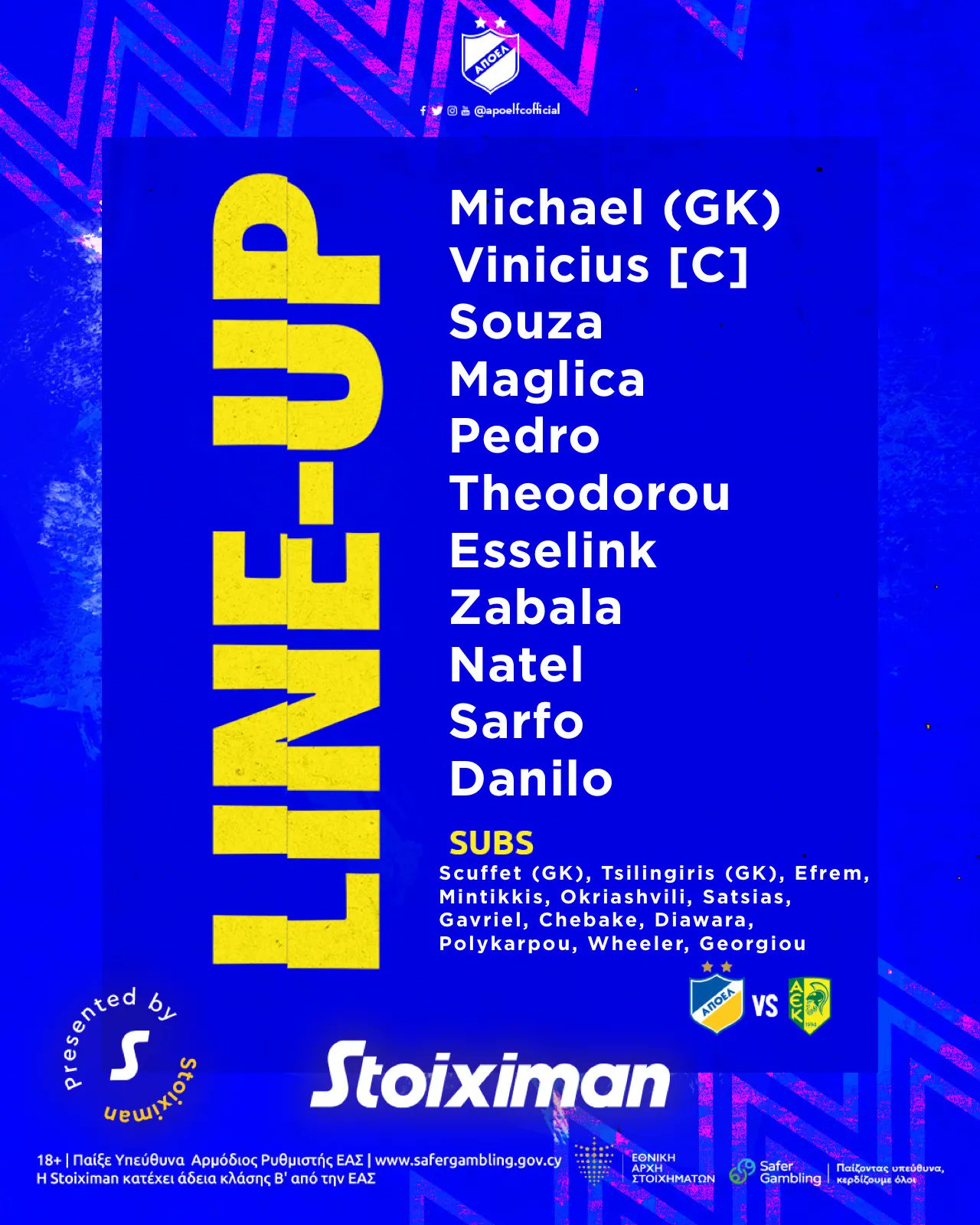 ΑΠΟΕΛ (4-2-3-1): Μιχαήλ - Πέδρο, Έσελινκ, Βινίσιους, Σαμπάλα - Σόουζα, Σαρφό - Θεοδώρου, Ντανίλο, Νατέλ - Μάγκλιτσα.