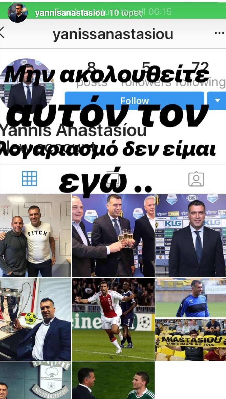 Συγκεκριμένα ο κόουτς της Ομόνοιας προειδοποιεί για ένα ψεύτικο λογαριασμό που απεικονίζει τον ίδιο και αποσαφηνίζει ο Αναστασίου να μην τον ακολουθήσουν γιατί δεν είναι αυτός.