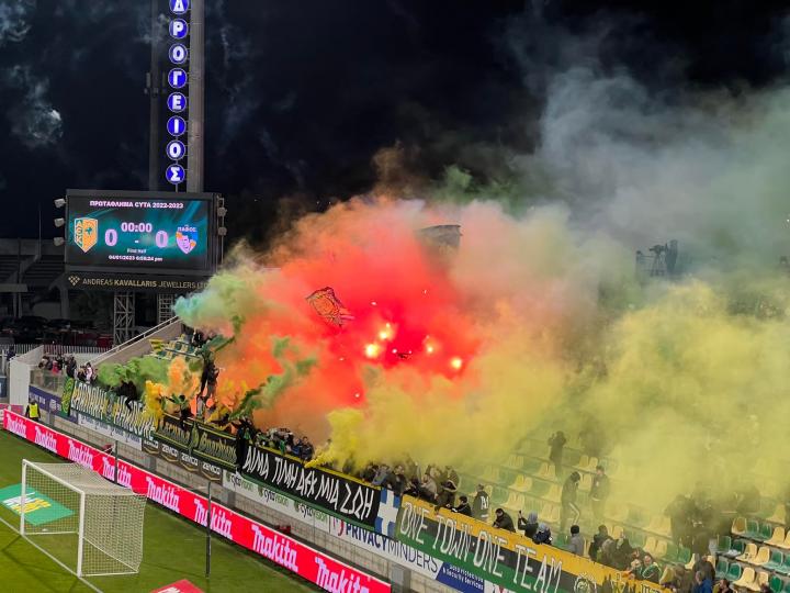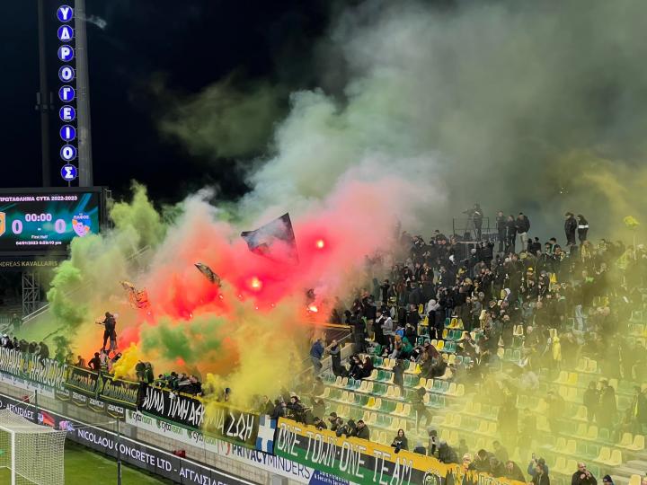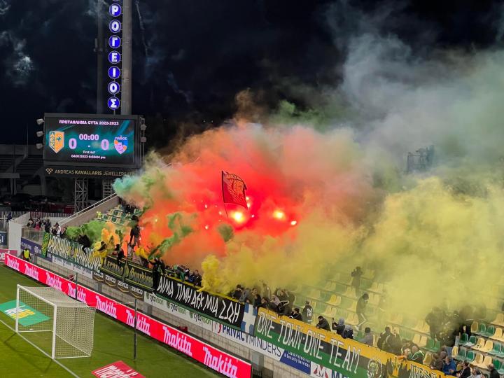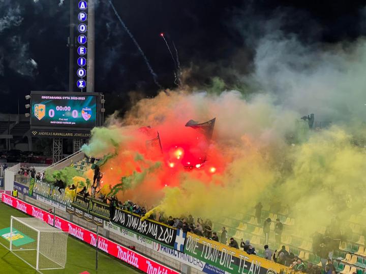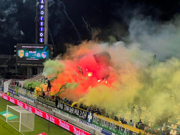 Με μια πλειάδα από βεγγαλικά και πυροτεχνήματα υποδέχτηκαν οι οπαδοί της ΑΕΚ την ενδεκάδα της ομάδας τους, όταν αυτή εισήλθε στον αγωνιστικό χώρο της Αρένας για το ντέρμπι με την Πάφο.