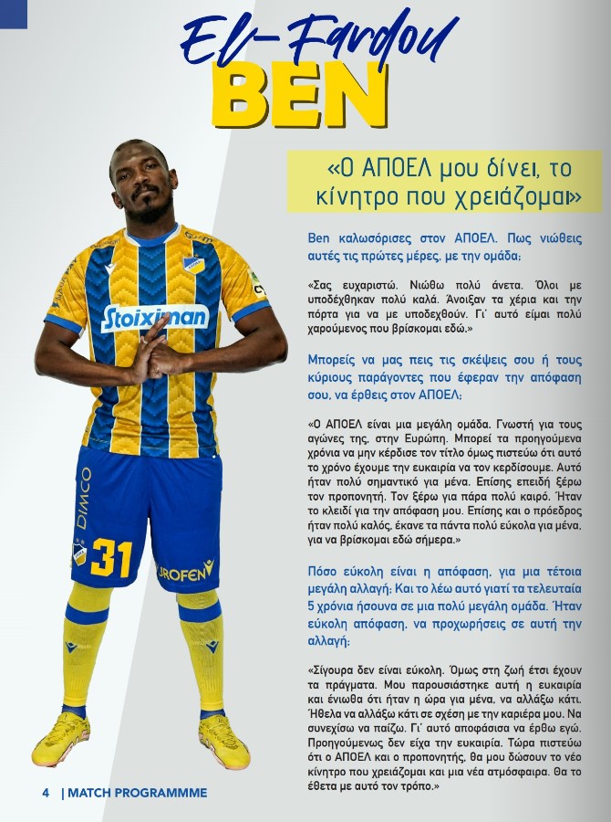 Ο ΑΠΟΕΛ δημοσίευσε το πρόγραμμα αγώνα για το ματς με τον Ακρίτα και σε αυτό φιλοξενούνται δηλώσεις του νέου αποκτήματος, Ελ Φαρντού Μπεν.