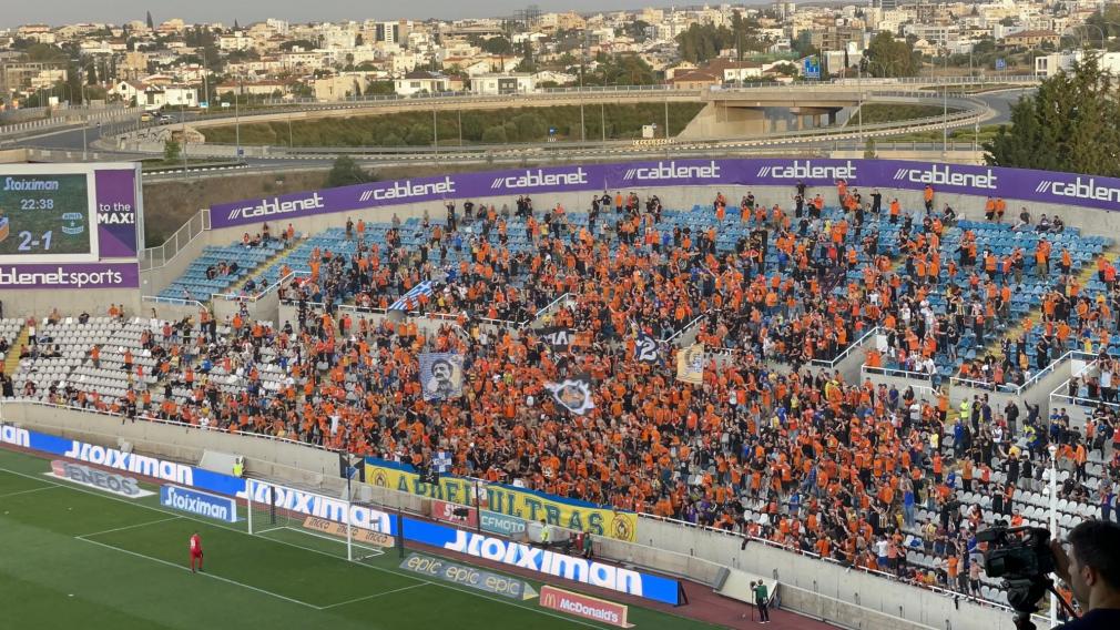 Ξεσηκώθηκε η νότια στην ανατροπή του ΑΠΟΕΛ στο ΓΣΠ! Από σέντρα του Φεράρι η μπάλα στρώθηκε στον Σαρφό που με δυνατό αριστερό σουτ στην πάνω δεξιά γωνία της εστίας του Άρη σημείωσε το 2-1.