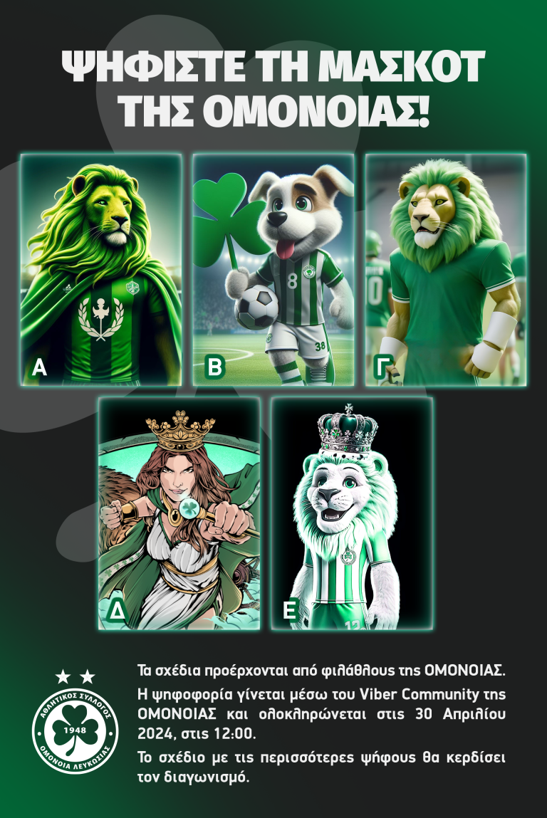 Ανακοίνωση από την Ομόνοια προς τον κόσμο της για να ψηφίσει τη μασκότ της ομάδας. Τα πέντε σχέδια προέρχονται από τον κόσμο.