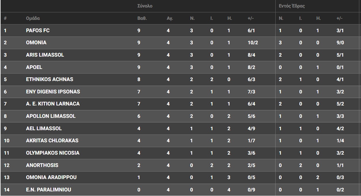 Με το παιχνίδι Πάφος – ΕΝΠ ολοκληρώθηκαν οι εκκρεμότητες του πρωταθλήματος και πλέον όλες οι ομάδες έδωσαν και τους τέσσερις αγώνες. Η σημερινή νίκη της Πάφου, έφερε και συνωστισμό στην κορυφή της βαθμολογίας, με τις Πάφο, Ομόνοια, Άρη και ΑΠΟΕΛ να έχουν από 9 βαθμούς. Η βαθμολογία δείχνει από τώρα ότι μας περιμένει ένα πολύ ανταγωνιστικό και δυνατό πρωτάθλημα.
