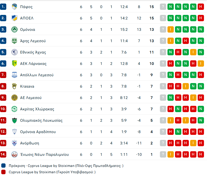 Πάφος και ΑΠΟΕΛ στην κορυφή, υποχώρησαν Ομόνοια, Άρης κι ΑΕΚ (βαθμολογία)
