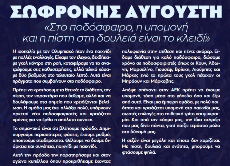 Αυγουστή: «Να έχουμε υπομονή κόντρα στην ΑΕΚ και την στήριξη του κόσμου» Α' ΚΑΤΗΓΟΡΙΑ ΑΠΟΛΛΩΝΑΣ 02.11.202511:48 Ο τεχνικός του Απόλλωνα, Σωφρόνης Αυγουστή, μίλησε στο Match Program της ομάδας τόσο για τον αγώνα που προηγήθηκε στο πρωτάθλημα κόντρα στον Ολυμπιακό όσο και στο ματς της 9ης αγωνιστικής με αντίπαλο την ΑΕΚ. Η ώρα της έδρας! Αναλυτικά: CLOSE