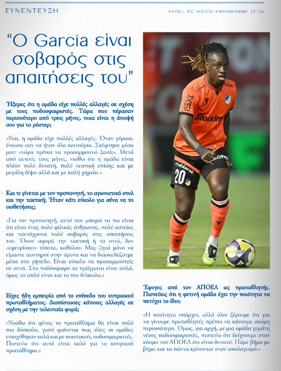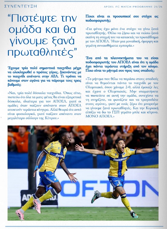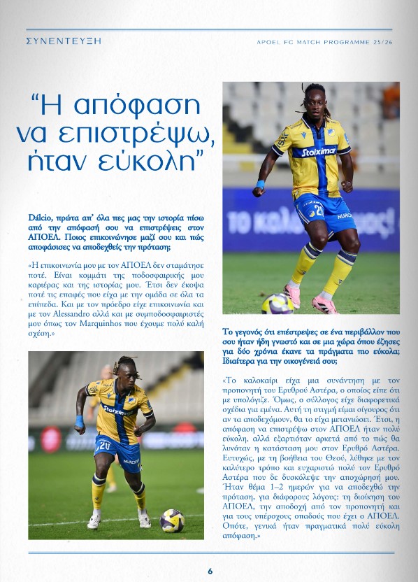 Ο Ντάλσιο έδωσε μεγάλη συνέντευξη στο match programme του ΑΠΟΕΛ ενόψει του αγώνα με την ΑΕΛ.