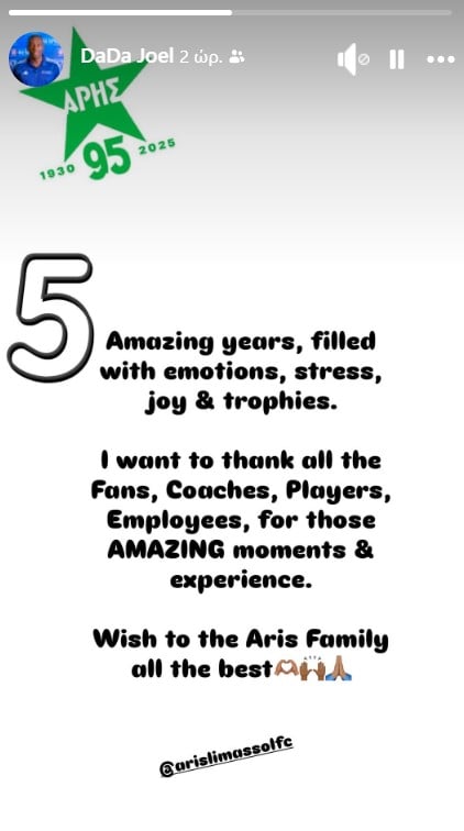Μετά την επίσημη ανακοίνωση του Άρη για την αποχώρησή του ο Ζοέλ Νταμάχου απηύθυνε το δικό του αντίο στον σύλλογο της Λεμεσού.