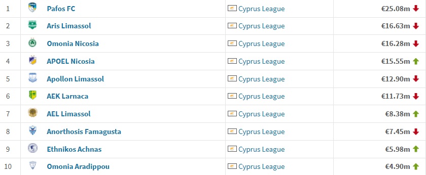 Όσον αφορά τα δικά μας δεδομένα, Πάφος-Άρης και Ομόνοια συμπληρώνουν την τριάδα των κυπριακών ομάδων. Και για τις τρεις ομάδες παρουσιάζεται πτώση από την προηγούμενη εκτίμηση όσον αφορά την εκτιμώμενη αξία του ρόστερ, με τον 4ο ΑΠΟΕΛ και την 7η ΑΕΛ να παρουσιάζουν άνοδο. Η διαφορά της πρωτοπόρου Πάφους με τον Άρη είναι στα 8,37 εκ.