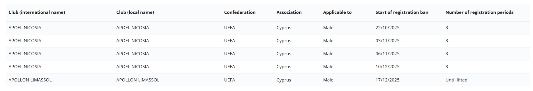 Σύμφωνα με σημερινή ανανέωση στην ιστοσελίδα της FIFA, μένουν άλλες τέσσερις εκκρεμότητες για τους «γαλαζοκίτρινους», ώστε να αρθεί πλήρως το εμπάργκο.