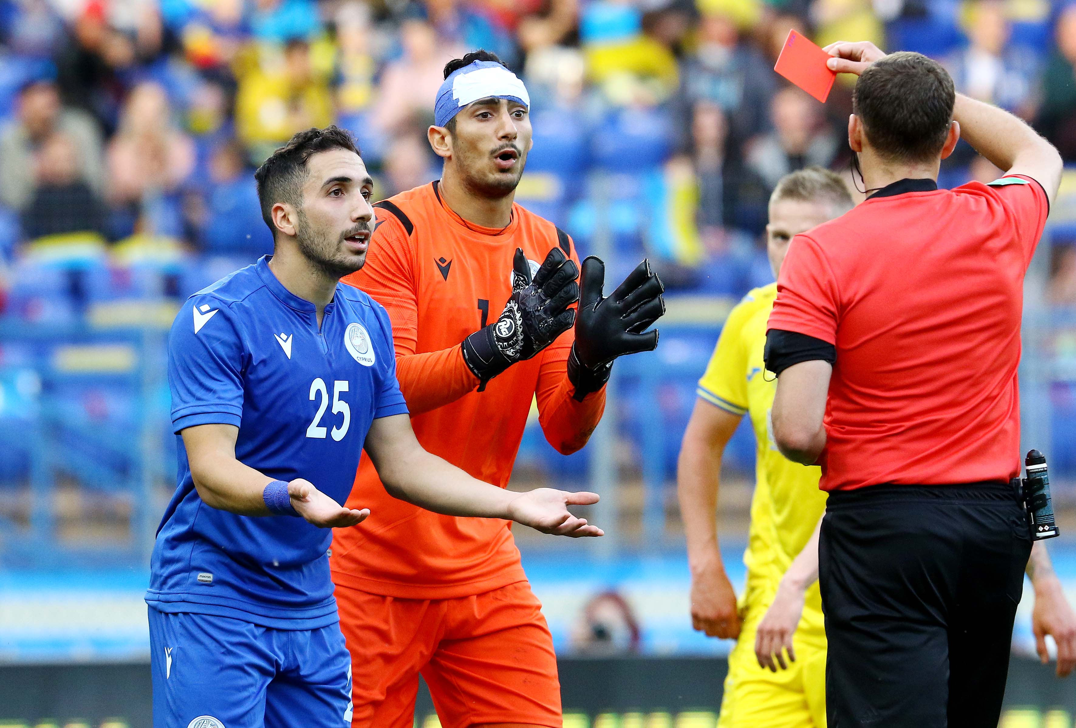 Η Κύπρος συνέχισε με αριθμητικό μειονέκτημα και μάλιστα με τους Ουκρανούς να παίρνουν προβάδισμα (1-0) καθώς αξιοποίησαν το πέναλτι με τον Γιαρμολένκο. Στις καθυστερήσεις του πρώτου ημιχρόνου διπλασίασαν τα τέρματά τους με δεύτερο πέναλτι (2-0, Σιτσένκο).